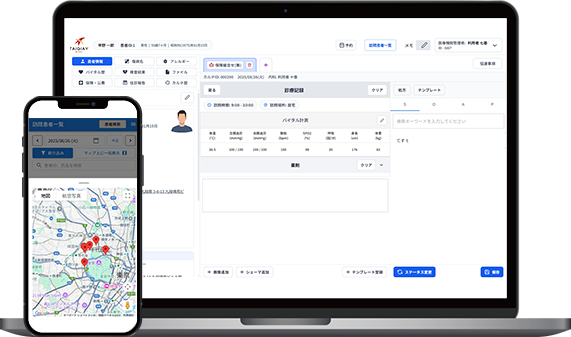 当社は、在宅医療の現場に寄り添い、現場の皆様の負担を減らして効率よく業務を行える環境を支援いたします。在宅診療に特化した電子カルテ関連ソリューション「タイザイ(TAIGIAY)」を通じて、業務の負担軽減と効率化を支援いたします。訪問診療ならではの課題に対応した設計と運用サポートにより、日々の診療をスムーズに、そして安全に行える体制を整えます。